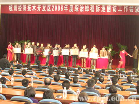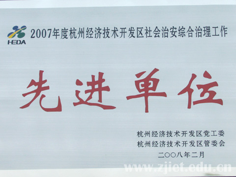3月4日,在杭州电子科技大学报告厅召开的杭州经济技术开发区2008年度综治、维稳、拆违、信访工作会议上,我院被授予2007年度杭州经济技术开发区社会治安综合治理先进单位称号。这是我院全体教职员工在学院党政领导下,积极开展“平安校园”活动,努力打造和谐校园建设的成果。2008年度,省综治委、省教育厅对我省高校平安校园建设提出了更高要求,希望全院教职员工再接再厉,争取学院治安综合治理工作再上新台阶、为和谐校园建设创造一个良好的校园环境。