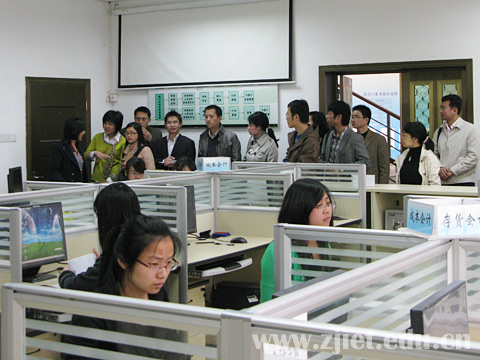 在宁职院期间,调研组以文理科大类分成两个大组,分别观摩了宁波职业技术学院两个生产性实训基地:电子应用系的电子元器件装配实训基地和会计系的宁商财务公司实训基地,并与实训指导教师就校内实训基地建设、课程改革以及实践教学模式等方面进行了深入的交流。同时,调研组还听取了宁波职业技术学院党委副书记史习明的介绍。史书记从学生学习的视角,提出了以加强学生管理的方式促进学风建设、推进教学改革的观点,另辟蹊径,给人以启发。